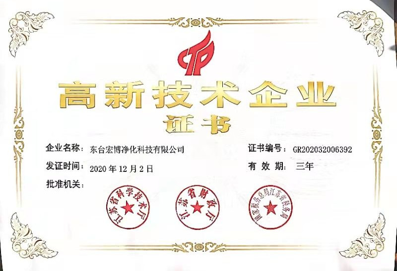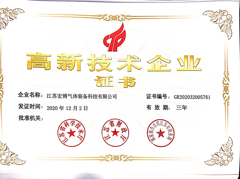 2020年,宏博企業(yè)江蘇宏博氣體裝備科技有限公司,生產(chǎn)基地-東臺宏博凈化科技有限公司同時獲評高新技術(shù)企業(yè),并于近日收到由江蘇省科學技術(shù)廳、江蘇省財政廳、國家稅務(wù)總局江蘇省稅務(wù)局聯(lián)合頒發(fā)的《高新技術(shù)企業(yè)證書》。